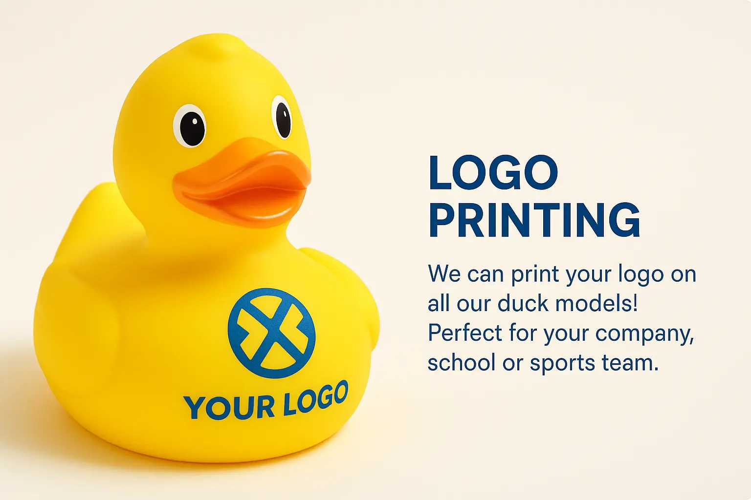 We can print your logo on all our duck models! Perfect for your company, school or sports team.